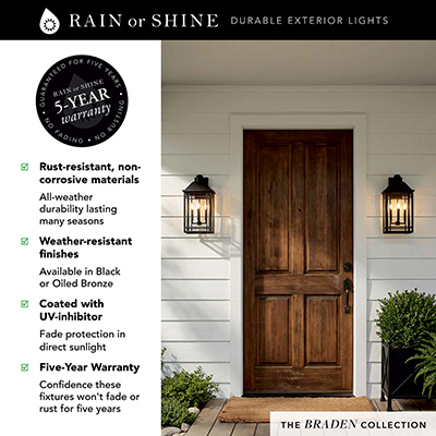 Create curb appeal with the Braden Wall Lantern. The Black finish accents the rectangular form, while the intersecting lines create visual intrigue on the clear glass. Part of our Rain or Shine Collection and backed by our five-year warranty.