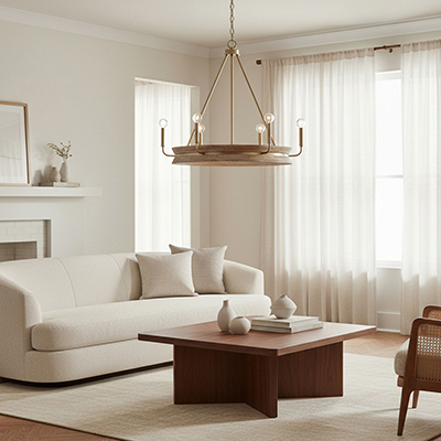 Effortlessly blending Matte Brass with white-washed mango wood, the Finn Chandelier creates a sophisticated aesthetic. The circular form and crisp angles add elegant dimension to this classic style.