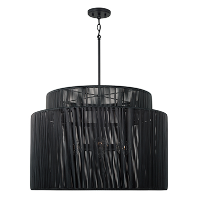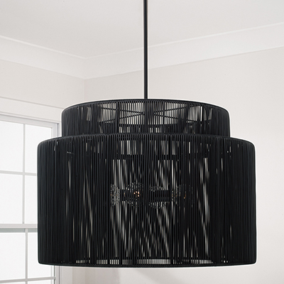 Purposefully crafted for interior and exterior spaces, the Jasper Indoor/Outdoor Large Pendant seamlessly blends durable design with high style. Paired with the Matte Black finish, the weather-resistant hand-wrapped resin delivers a modern aesthetic in a tiered drum silhouette. Rated for Damp Locations and backed by our one-year warranty.